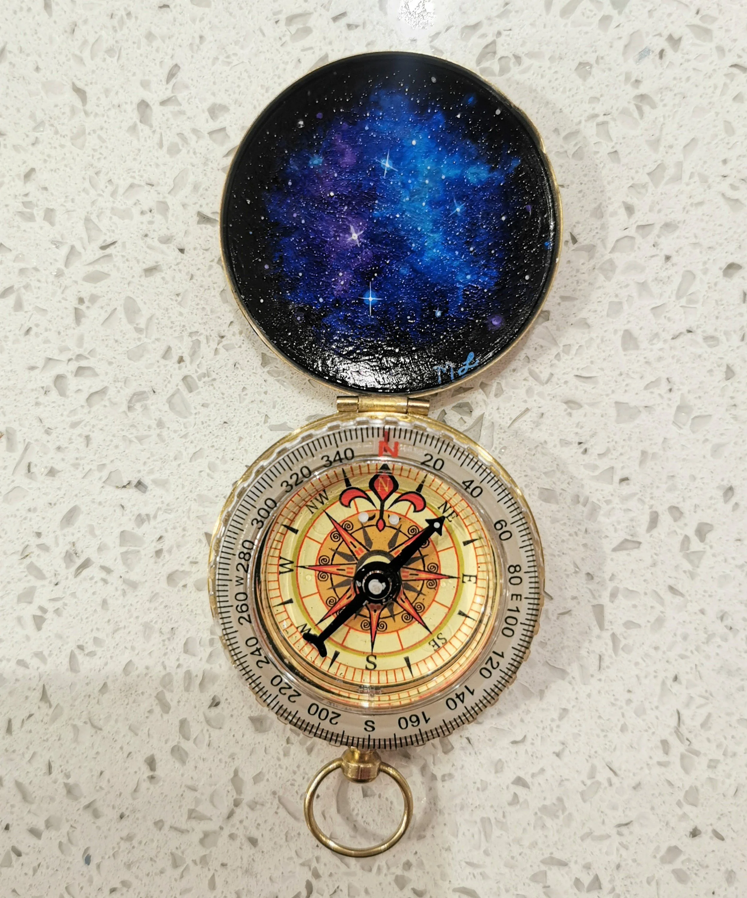 I've hand-painted a blue and purple galaxy on the inside lid of this traditional compass. I used acrylic paint and finished it with a high gloss varnish. In certain angles of light, you can see the broad brush strokes I've laid down before adding the smaller fine details in. Each compass is one of a kind, all individually painted by me.