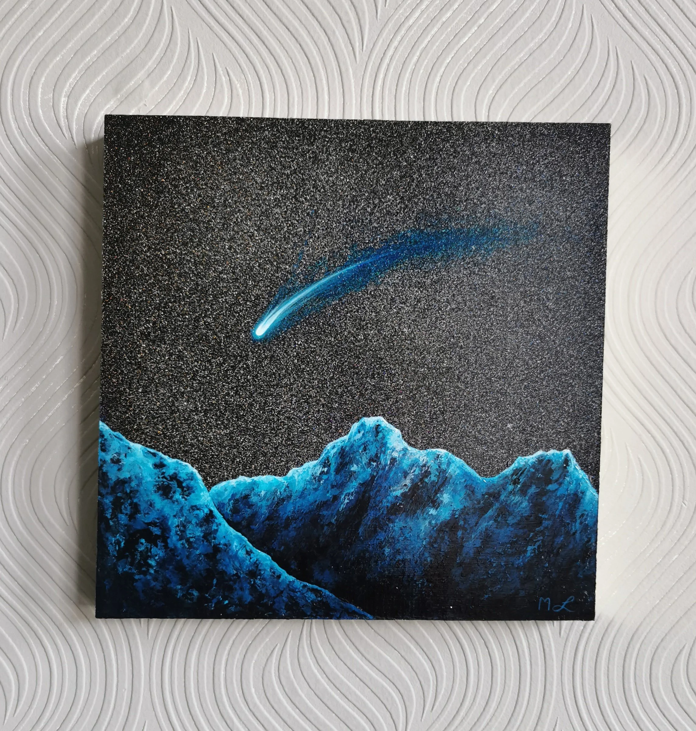 This acrylic painting is of a dreamy mountainscape. The background is filled with micro-sparkles to mimic stars. When the sun shines on it the sky glitters beautifully.